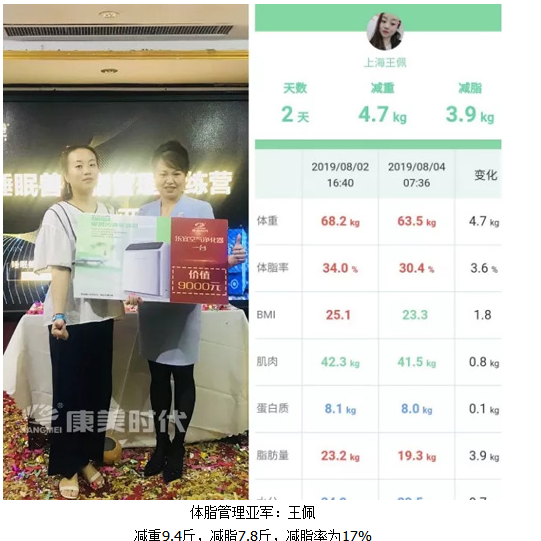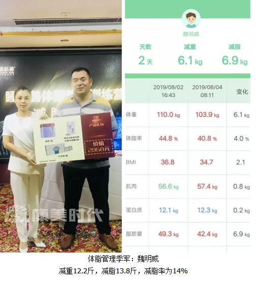 本场体脂管理训练营共73人参加,仅用2天时间,总减重436.8斤,减脂404.2斤。其中,减脂率排名前三的伙伴,现场直接将大奖搬回家!