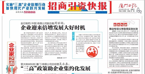 为实现经济高质量发展,厦门正在着力扶持“高技术,高成长,高附加值”的企业做强做大,日前,厦门市出台了《关于实施高技术高成长高附加值企业倍增计划的意见》,具体21条措施,包括鼓励企业增产增效、提升企业研发创新能力、加大财政金融扶持力度、强化人才要素供给、给予生产要素配套及优化提升企业服务等六大类,全力支持“三高”企业培育和发展。香港金日投资集团作为厦门重点扶持的“三高”企业代表,集团副总裁周丽娟博士日前接受了厦门电视台、《厦门日报》、厦门新闻广播等媒体的联合采访。