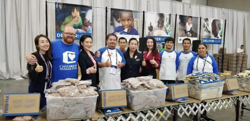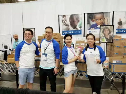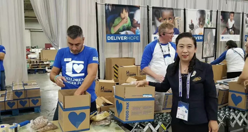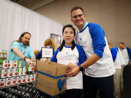 年会期间,刘薇前往USANA真正健康基金会爱心包裹打包区,与USANA大家庭的伙伴们一起为全世界需要帮助的小朋友们打包爱心餐。