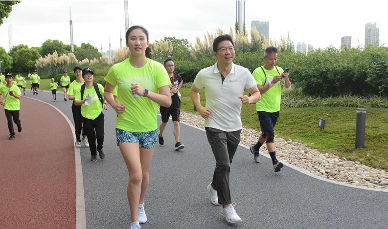 花样游泳世界冠军孙怡靖(左)和安利中国副总裁黄圣文领跑。(安利公司提供)