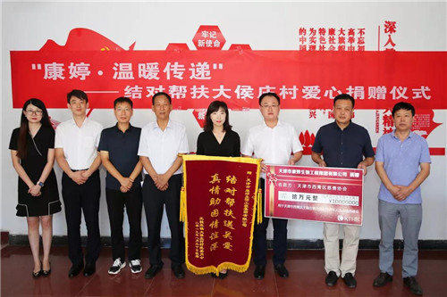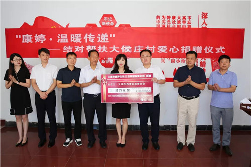 勇担社会责任,助力精准帮扶。康婷集团为深入贯彻党的十九大精神和习近平总书记关于精准扶贫、精准脱贫的重要指示,推动企业结对帮扶困难村工作,2019年8月30日,在天津市西青区王稳庄镇大侯庄村举行了“康婷·温暖传递”——结对帮扶西青区王稳庄镇大侯庄村爱心捐赠仪式。天津市西青区慈善协会会长郭宝印、天津市西青区王稳庄镇政府副镇长赵德坤、天津市西青区结对帮扶大侯庄村驻村工作组组长、第一书记吴建伟、天津市西青区王稳庄镇大侯庄村党总支书记刘超、天津市康婷生物工程集团有限公司企划中心总监王梓童、工会主席屈洪伍、总裁助理蔡馥阳参加了此次活动。