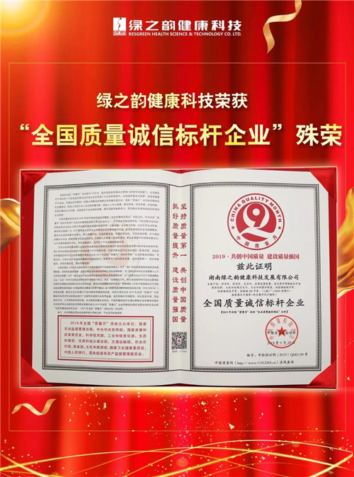 “共创中国质量,建设质量强国”,为大力提升全社会质量意识,严格落实企业质量主体责任,有效激发市场主体质量发展活力,国家市场监督管理总局、中共中央宣传部、国家发展和改革委员会等14个部门联合主办了2019年全国“质量月”活动。绿之韵健康科技凭借精湛的品质及企业诚信度,荣耀加冕“全国质量诚信标杆企业”。