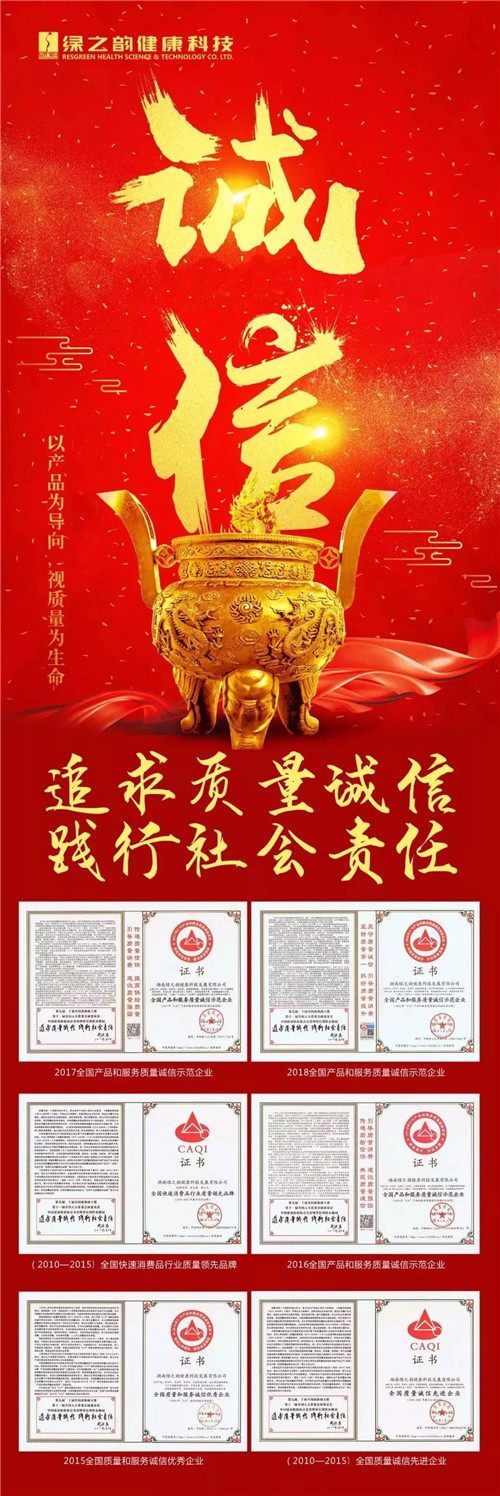 这不是绿之韵健康科技第一次获得中国质量检验协会的青睐,自2010年开始,我们已经连续九年荣获:(2010—2015)全国质量诚信先进企业、(2010—2015)全国快速消费品行业质量领先品牌、2015全国质量和服务诚信优秀企业、(2016—2018)全国产品和服务质量诚信示范企业,今年更是荣获全国产品和服务质量诚信示范企业、“全国质量信用先进企业”,绿之韵健康科技“益生源”、“倍齿健”、“玉牡丹”系列产品荣获全国质量检验稳定合格产品。现在又获得“全国质量诚信标杆企业”殊荣,这些荣誉的获得是对绿之韵健康科技长期以来在产品质量领域取得成绩的肯定与鼓励。