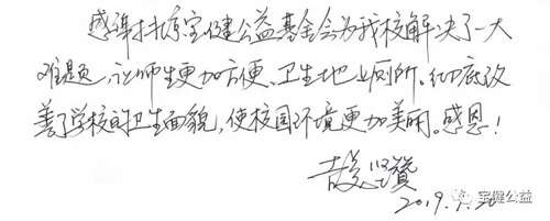 直到前不久,校园里举行了新厕所开工奠基仪式,听老师们讲是‘北京宝健公益基金会’捐资援建。同学们欢呼雀跃不已。每天都盼望着新厕所早日建成。