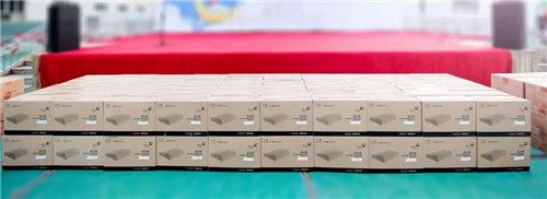 在现场嘉宾和师生的见证下,黄健龙先生代表公司将物资牌匾交接给吴晓青女士。