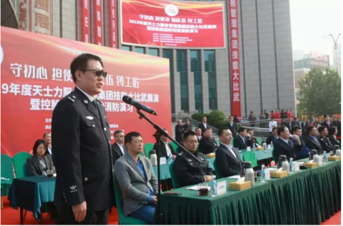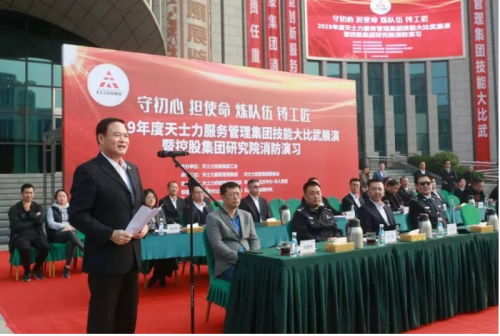 天士力服务管理集团董事长田雨宣布活动开始2019年度的技能比武大赛共分两阶段:第一阶段从今年上半年开始,各专业先后进行了交叉轮岗练兵、实训基地比武考核以及环境保洁、工程运维、运输餐饮等6个专业、10余场次专项技能比武,涉及19个具体科目。此次举行的是第二阶段现场汇报展演,包括现场技能展示、反恐演习、消防演习三部分。无论动员规模、筹备时间,还是参演科目、覆盖范围,此次技能比武活动均为公司成立以来规模最大的一次。