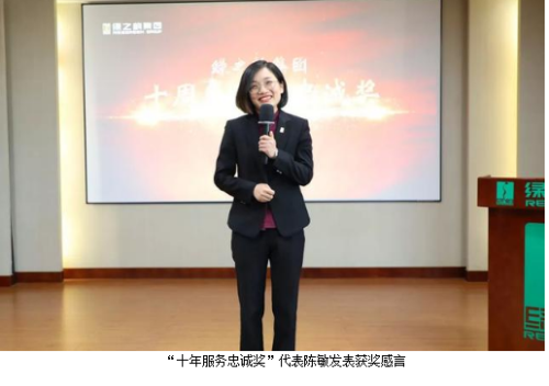 随后,绿之韵集团董事、总裁劳嘉讲话。她在讲话中首先向第三季度获得优秀称号的集体与个人表示祝贺,向五年服务英才奖、十年服务忠诚奖获得者表示祝贺和感谢。她在讲话中表示,员工大会是绿之韵“家”文化的一种表现形式,更像是家人们自己的舞台。今天听到五年和十年员工的分享深受感动,这些优秀的伙伴是每一位家人的榜样,感谢从公司成立至今,为绿之韵事业发展添砖加瓦的各位优秀员工们。今天大会的主题是“追梦赤子心”,梦想不仅是一种人生激励,更是对自我的要求。绿之韵承载了所有事业伙伴和员工的梦想以及身后每一个家庭的梦想,深感责任重大。劳总向家人们分享了她在电影《攀登者》里的深刻体悟:“山不在那里,山在每一个人心中。”每个人心里都有一座山,希望所有绿之韵家人能够不抛弃不放弃、突破自我、坚定信心、勇于攀登,成就更好的自己。