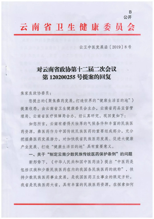 云南省卫生健康委回复焦家良委员提案:望继续关心支持我省民族医药事业的发展