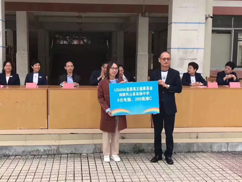 时隔一年,飞鹰腾飞国际爱心之家慈善团队再次来到广西河池凤山高级中学,持续用实际行动,推进精准脱贫攻坚。活动当天,飞鹰腾飞国际爱心之家慈善团队向凤山高级中学捐赠了五万元的优秀教师基金。除此以外,葆婴有限公司华南区域销售总监杨飞先生代表USANA葆婴真正健康基金为孩子们带来了6台电脑以及葆苾康营养品,帮助贫困学生紧跟信息时代步伐,改善学生健康状况,成就大学梦想。