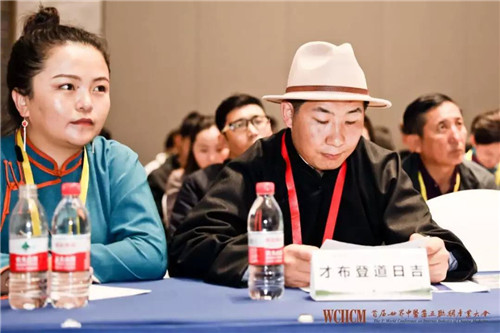金诃藏药国家级非物质文化遗产代表性项目代表性传承人桑杰(中)在大会上