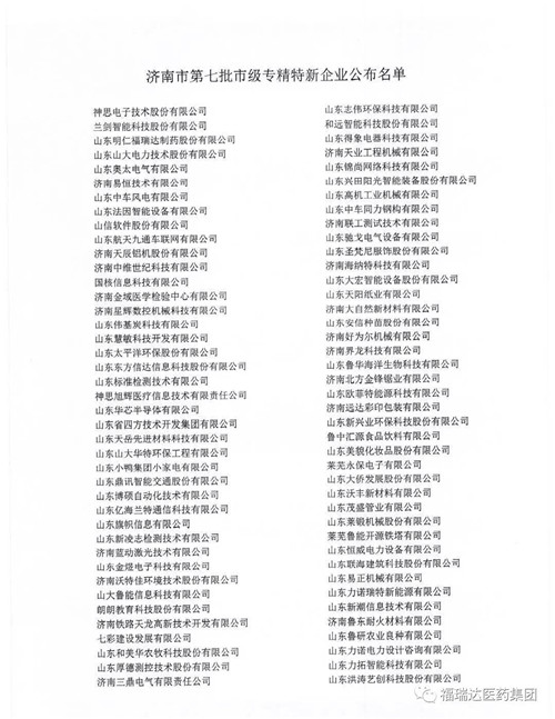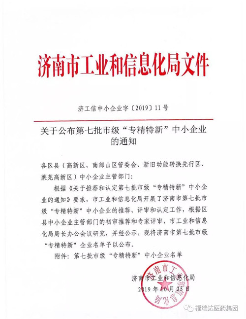 近日,济南市工业和信息化局发布《关于公布第七批市级“专精特新”中小企业的通知》,山东明仁福瑞达制药股份有限公司荣获“市级‘专精特新’中小企业”认定。