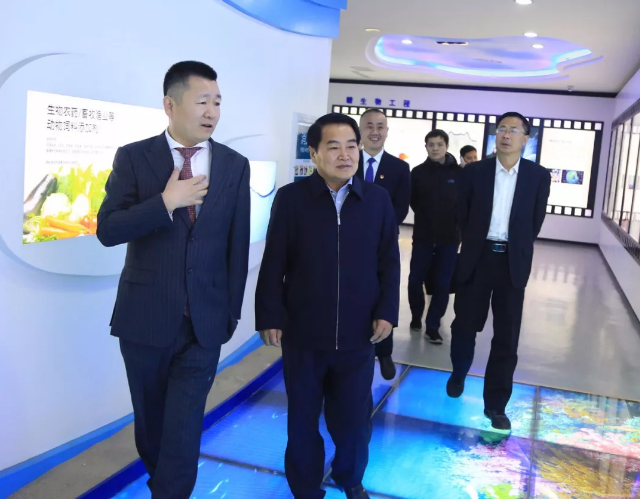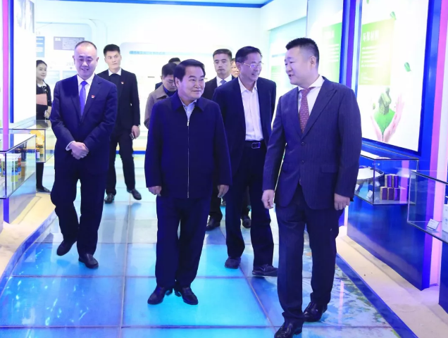 刘仕江一行首先参观了集团甲壳素科技馆与文化馆,在参观过程中,集团 董事长、总裁王宗继向刘仕江一行介绍了“一体两翼”战略、科研团队、产品研发、康养项目建设、赋能系列产品、孝爱文化传承与践行等内容。