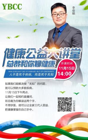 目前《健康公益大讲堂》已经开展一期健康公益课程,由益宝高管李俊毅先生率先开讲《人不是死于疾病 而是死于无知》,如果我们能解决掉“无知”的问题,就可以预防大多数疾病,理解这两个字,不用学医,就可以让全家三代人受益,把健康掌握在自己手中。