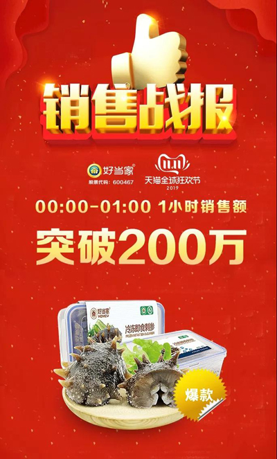 据天猫后台数据显示,天猫“双11全球购物狂欢节”启动后1小时,好当家食品旗舰店成交额就已突破200万,并最终保持这种良好势头一路飙升。在全民剁手日,有多少好当家有机刺参的忠实粉丝给当天的总成交额做出了贡献呢?全天订单量近3000单,客单价2048元,是2018年的2倍,实现100%的同比增长。