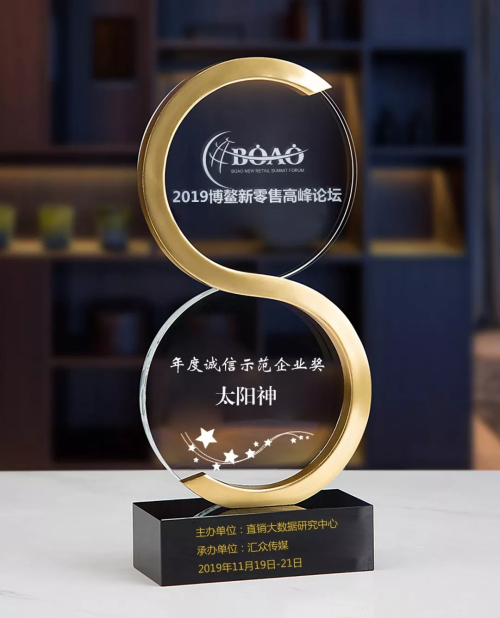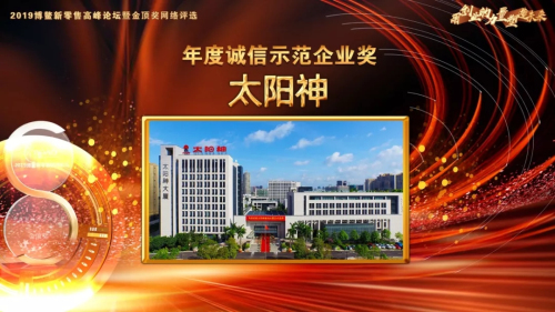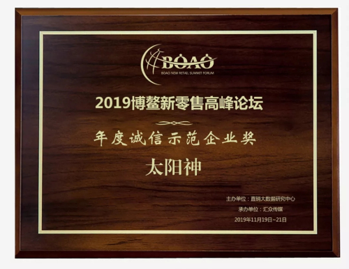 广东太阳神集团有限公司始终坚持着让政府放心、让老百姓放心、让经销商有信心的原则,以企业公民的角色肩负起对产品质量负责的态度,由此荣获2019博鳌新零售高峰论坛“年度诚信示范企业奖”。