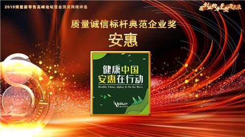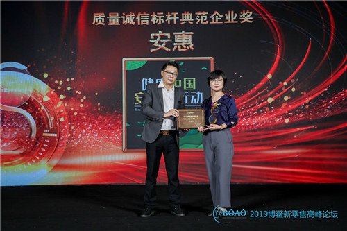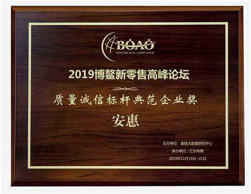 江苏安惠生物科技有限公司始终坚持严苛的产品质量标准,科技为先、服务至上的经营理念,获得2019博鳌新零售高峰论坛“质量诚信标杆典范企业奖”。
