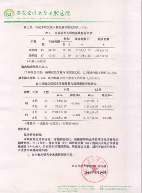 据西安交通大学口腔医院临床报告表明,蛹虫草植萃多效药膏每天刷两次,在12周时,抑菌指数(PI)和牙龈指数(GI),组间具有统计学显著差异(P<0.01),具有抑制牙菌斑形成,降低龈炎指数,减轻牙龈炎的效果,有改善牙龈健康的作用。同时在临床研究中,未发现副作用。