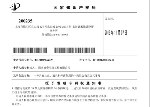 近年来,炎帝生物坚持高质量发展不动摇,在研发创新领域不断加大投入,公司现有授权专利21项,其中发明专利15项,实用新型专利4项,形成了自己的知识产权体系。2019年,炎帝生物相继获得国家《知识产权管理体系认证证书》、“湖南省工业领域知识产权运用标杆企业”认证、“2019年度国家知识产权优势企业”等荣誉。这些成绩的取得将有力地促进炎帝生物在创新能力和核心竞争力建设,为推动炎帝生物中医健康管理的发展起到积极的促进作用。