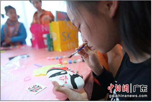 随后,志愿者还和异地务工人员子女共同DIY粤剧脸谱,蓝脸的窦尔敦、红脸的关公、黑脸的张飞……在了解了粤剧的相关知识后,参与者们发挥各自的创意和想象,用画笔组合不同的颜色,描绘出一张张富含情绪和表现力的脸谱,让粤剧曲艺的独特魅力更加立体地被传递出去。