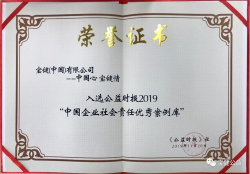 宝健持续坚守企业社会责任的行动赢得了专业机构、媒体平台的青睐与认可。在不久前举办的“2019中国企业社会责任高峰论坛”上,“中国心 宝健情”社会责任实践案例在110家企业案例中脱颖而出,与阿里巴巴、吉利控股等30多家知名企业一起入选“2019中国企业社会责任优秀案例库”。
