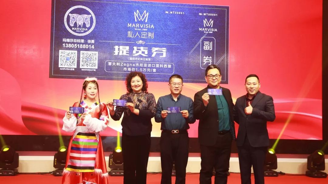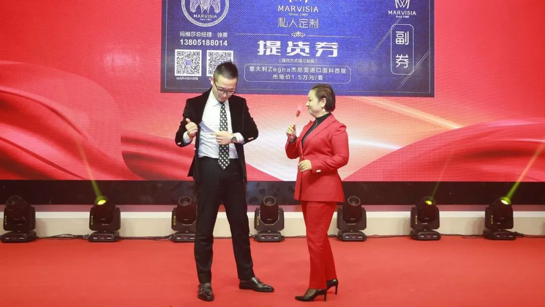 MARVISIA国际时装有限公司总经理徐勇先生登台,与苏州市滨海商会副会长王菊女士现场演绎了MARVISIA服装私人定制的独特魅力,并现场讲解了MARVISIA的品牌优势和时尚前卫的设计理念,受到商会成员的一致赞誉。现场,新创人力资源有限公司董事长施爱民先生,当场预定了50张MARVISIA“杰尼亚面料量体定制西服提货券”。