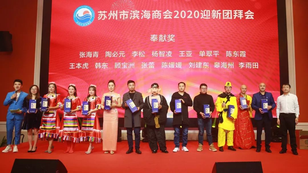 本次团拜会还对为商会做出特殊贡献的成员进行了嘉奖。其中,苏州市滨海商会常务副会长周俊登台,为全年义务为商会制作广告的陈兰娟顾问、今年向商会赞助价值4万礼品的王黎明顾问、时常义务为会员排练活动的任芳理事、党建指导员肖剑4位优秀会员,各颁发MARVISIA品牌杰尼亚面料定制西服1套,借此激励所有成员以优秀会员为榜样,充分调动工作积极性,共同为商会的发展贡献力量。