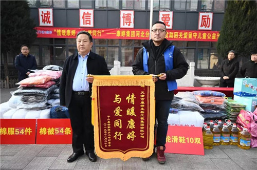 在现场的捐赠仪式上,平山县县委领导对康婷集团的关注与慰问表示感谢、也对康婷集团的善举表示由衷的赞许。平山县杨家桥乡大坪村村委会为康婷集团送上“情暖康婷、与爱同行”的锦旗以示感谢。康婷集团河北省分公司经理刘若昕也转达了康婷集团对孩子们的关心和期望,希望他们能够快乐学习、健康成长。同时,也希望这里的贫困、弱势群众在社会的帮助下能够生活的幸福安康。