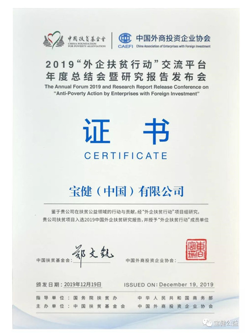 在本次活动上,“宝健精准扶贫自主创业项目”案例与40余家外企的扶贫案例一并入选《中国外商投资企业参与脱贫攻坚调查分析报告》,同时,宝健还被授予“外企扶贫行动”成员单位。