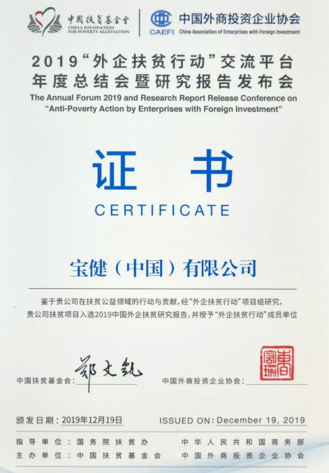 自2017年,国家发起精准扶贫攻坚行动以来,外商投资企业积极参与脱贫攻坚,成为我国社会力量扶贫的新生力量,通过教育扶贫、产业扶贫、健康扶贫、就业扶贫等多种形式,开展有针对性的扶贫工作,落地了很多扶贫的项目,在中国扶贫开发工作中发挥了积极的作用。 宝健,作为优秀的外资企业于1996年在首都北京注册运营。20多年来,宝健始终以“中国心、宝健情”的爱国情怀积极投入到国家和地区经济建设,累计实现纳税额45亿元。同时,在社会发展、人文关怀、公益慈善等诸多领域,宝健以实际行动分享关爱、践行责任:在公益事业方面已累计投入3亿元,全国捐建一百余所宝健希望小学,帮助15万少年儿童实现求学梦想;积极开展社会创业项目,帮助超过12万人成功就业创业;积极投身各项抗震救灾和慈善捐助,曾获得“中华慈善奖”提名,并被授予“希望工程25年杰出贡献奖”、“希望工程30年突出贡献者”等多项荣誉称号。 脱贫攻坚即将迎来决战时刻,宝健公司及全体1%爱心志愿者坚信:在中国共产党的坚强领导下,全国人民、社会各界同心同向、戮力前行,幸福感、获得感、安全感不断增强,全面小康的伟大历史时刻指日可待。宝健将继续坚定支持国家和社会发展,为两个一百年目标、为实现中华民族伟大复兴,继续努力奋斗,矢志不移!