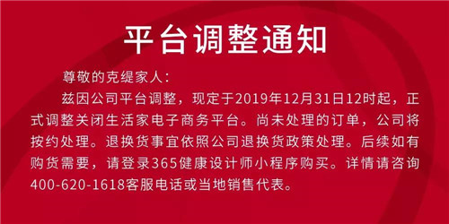 兹因公司平台调整,现定于2019年12月31日12时起,正式调整关闭生活家电子商务平台。尚未处理的订单,公司将按约处理。退换货事宜依照公司退换货政策处理。后续如有购货需要,请登录365健康设计师小程序购买。详情请咨询400-620-1618客服电话或当地销售代表。