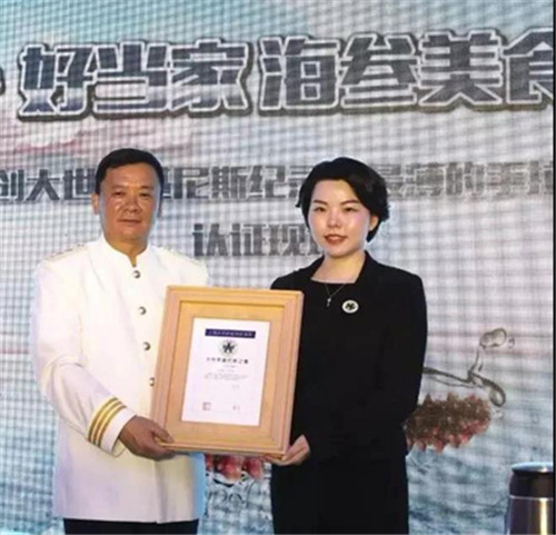 高速建大师与好当家海参的渊源由来已久,今年8月7日,高速建大师采用好当家有机活海参为原料,在两位助理的配合下向手拉活海参最薄世界记录发起挑战。经3分钟抻拉,原来圆筒状布满圆锥形肉刺的活海参变成了长85厘米,宽55厘米,薄0.0018毫米的完整薄片,再次刷新记录,最薄的手拉活海参挑战成功,上海大世界基尼斯总部颁证官副总经理高文女士为高速建大师颁发了世界纪录证书。