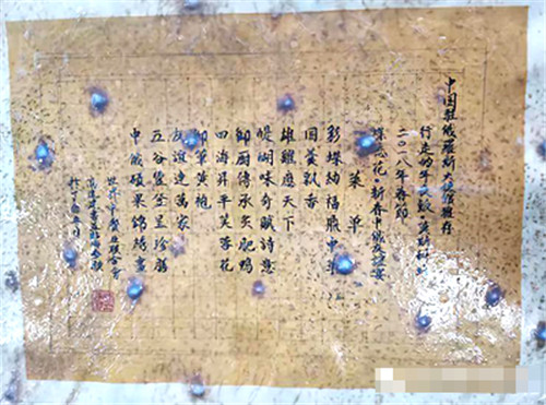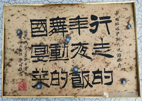 由于海参薄膜的透明度不均匀和海参刺的地方略带灰黑色,使覆膜的书画艺术作品具有淡远高古、古色古香的艺术风格,但和仿古作品不同的是,她具有天然的质朴之美。另外,海参膜画艺术作品赋予了传统书法艺术作品一种特殊的迷离感和朦胧之美,具有一定的神秘效果,非一般书法艺术作品所具有。由于海参膜具有良好地密封性,可以起到阻挡水汽、烟雾、粉尘等造成的对书法艺术作品的损害,能够在一定的程度上对保护和延长纸质书法作品的寿命起到一定的保护作用。而且由于海参含有稳定结构的蛋白质,其组织结构非常稳定,不会开裂和脱落。