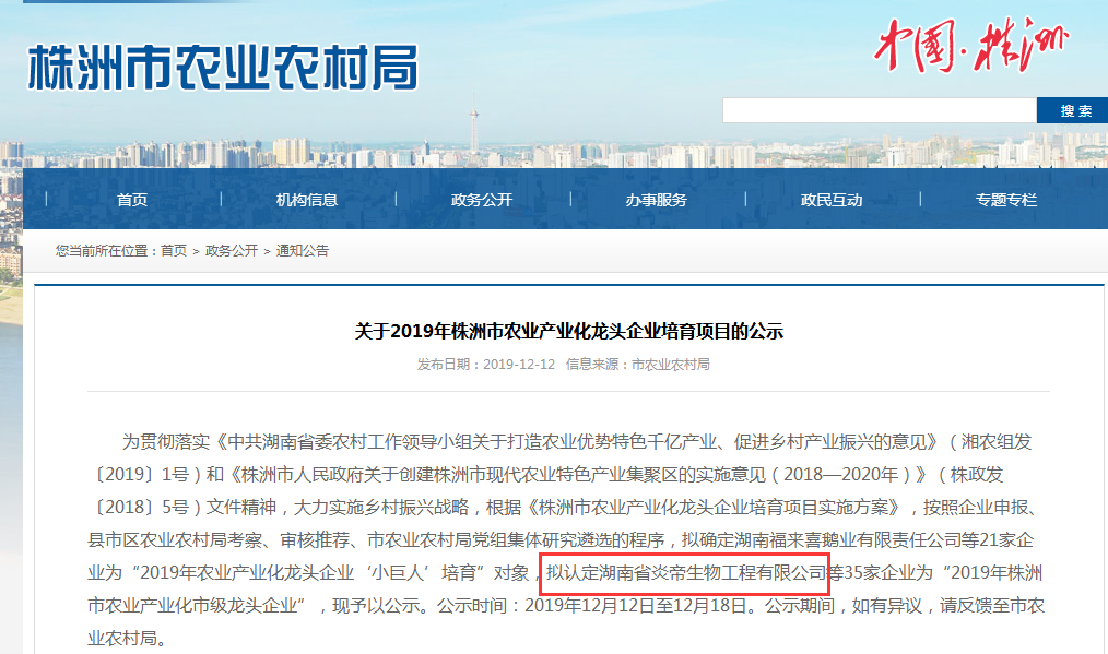 岁末年终之际,炎帝生物再获殊荣,被株洲市农业农村局认定为“2019年株洲市农业产业化市级龙头企业”。
