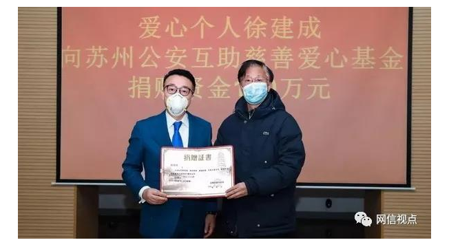 2020年2月,徐建成代表绿叶向苏州公安慈善爱心基金捐赠100万;