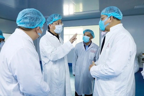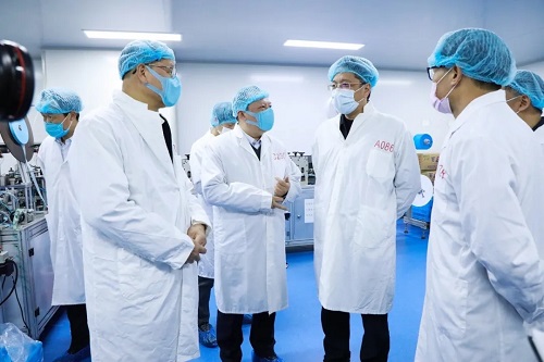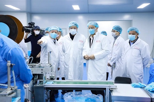 郭锡文书记(右四)在高益槐教授、高炜总裁陪同下察看口罩生产线