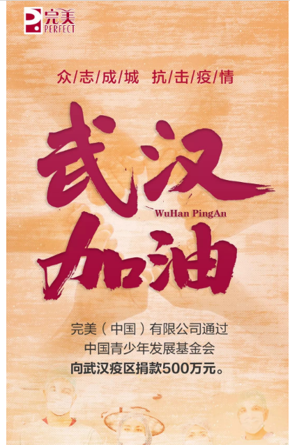 1月26日,完美(中国)有限公司积极响应,通过设立于中国青少年发展基金会的“完美和谐公益基金”向湖北省武汉市等疫情严重地区紧急捐款500万元,参与“抗击疫情·希望同行——希望工程特别行动”,支援武汉抗击新型冠状病毒肺炎疫情。