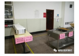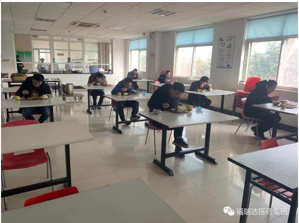 为了支援疫区用药,明仁福瑞达旗下小儿解感颗粒生产线紧急复工。战斗的不仅仅是生产线,作为服务保障的员工餐厅,全力做好餐厅各区域的消毒并为忙碌在一线的员工送上了热腾腾的饭菜,用实际行动,彰显了后勤保障的价值。为避免人员交叉感染的可能性,餐厅实行进门消毒、间隔排队,测量体温后,一人一桌,快速用餐。结束一天的忙碌后,一天三次全面消毒的班车会将大家安全送回家,保障了员工的安全和身体健康。