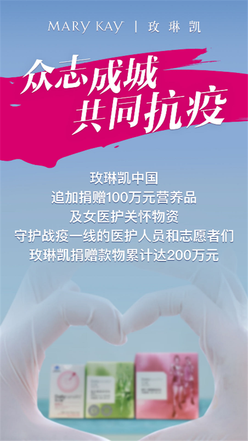 转眼,抗疫之战已打响一个月,玫琳凯(中国)有限公司(以下简称“玫琳凯”)关注到一线女性医护人员及志愿者们长期处于超负荷的工作状态,身心疲惫。为此,玫琳凯于近日通过上海市慈善基金会和上海市儿童基金会追加捐赠了一批市场价值100万元的营养品及护肤护手物资,用于关爱医护人员高强度的辛苦付出,并呵护她们的“口罩脸”和双手。截至目前,玫琳凯针对此次疫情的捐赠款物累计达200万元。