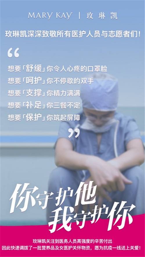 “玫琳凯深深致敬医护人员及志愿者们!长时间高强度的工作,不规律的三餐和作息想必让他们身心俱疲。虽然我们不能生产口罩和防护服,但玫琳凯相信自己也能成为抗疫一线的坚强后盾!”玫琳凯相关负责人表达了对医护人员的慰问。