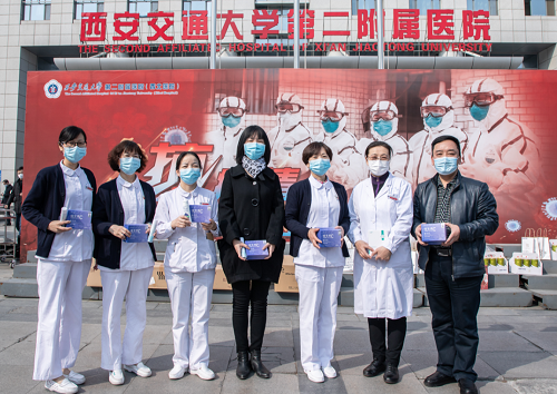 同日,三八妇乐集团向西安交通大学第二附属医院捐赠了130套防疫套装(包括医用面膜、免洗凝胶、喷雾、维C),感谢每一位逆行而上的“她”。西安交通大学第二附属医院妇产科主任医师谢秀英代表医院接受捐赠。