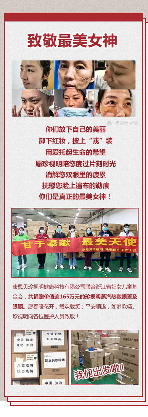 自疫情发生以来,战疫一线的白衣天使们不辞辛苦、日夜坚守,将全国人民庇护在羽翼下。康恩贝珍视明捐赠蒸汽热敷眼罩是希望每位医护人员,在救治工作结束后的片刻时间里,能够得到更好的休息;同时,考虑到长期佩戴口罩对女性医护工作人员产生的肌肤压力,以及长期处于医院消毒水的环境中对肌肤产生的刺激,公司又捐赠了可以全脸敷贴的眼膜,希望给这些在抗疫一线的援鄂医疗队的各位医护人员多一份呵护。