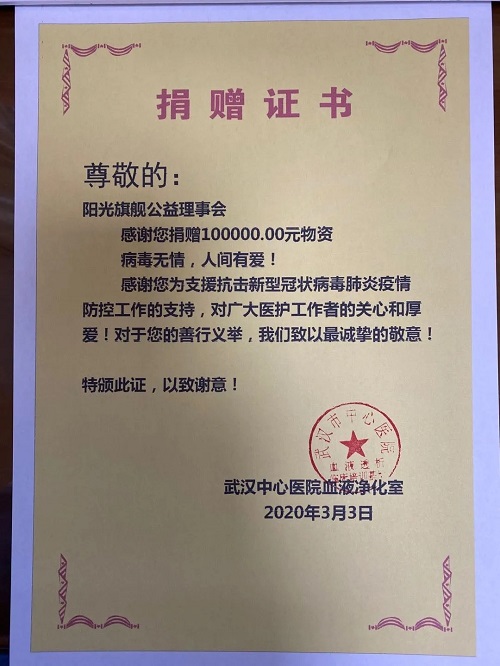 与此同时,武汉市中心医院血液净化室为康婷·阳光旗舰公益理事会颁发了“病毒无情,人间有爱”的捐赠证书。