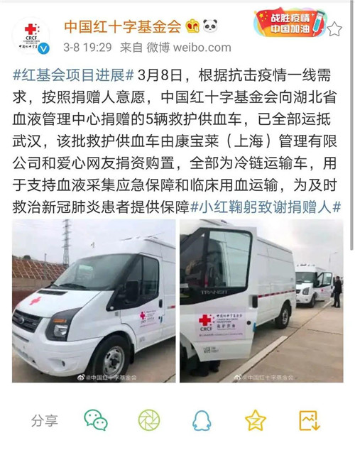 为支持新冠肺炎疫情防控,康宝莱已携手广大爱心服务提供商通过中国红十字基金会向武汉市及周边疫情较严重地区累计捐款260余万元。在捐款使用方面,该笔款项由中国中国红十字基金会安排购置2辆救护供血车、9辆普通救护车用于疫情防控工作。日前,2辆救护供血车已经运抵武汉,顺利交付给湖北省血液管理中心投入使用。该批车辆全部为冷链运输车,用于支持血液采集应急保障和临床用血运输,为及时救治新冠肺炎患者提供保障。康宝莱方面捐款采购的另外9辆普通救护车也将陆续采购运送到位。