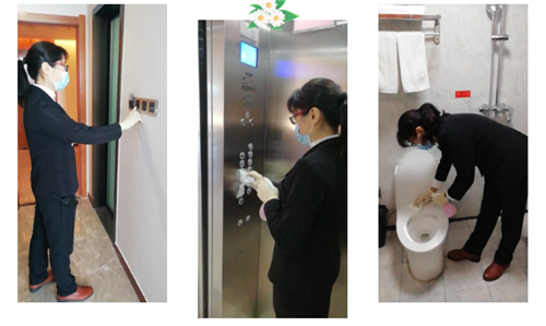 客人到达酒店后,无论入住与否都要进行体温测量,并进行消毒。每天酒店都会对酒店公共区域及客房的门把手、房卡、电话机等被频繁接触的地方进行消毒。