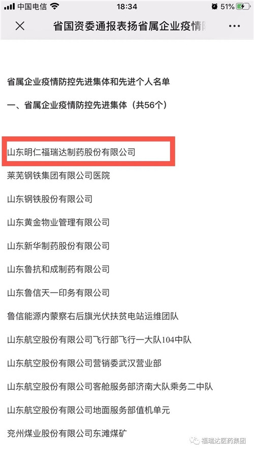 明仁福瑞达获省国资委防控先进集体荣誉称号