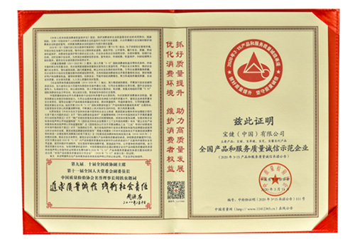 宝健公司及旗下产品凭借长期稳定的质量保证和诚信践行赢得了权威机构和广大消费者的认可,再次获得由中国质量检验协会认证的“全国产品和服务质量诚信示范企业”和“全国质量检验稳定合格产品”双料殊荣。