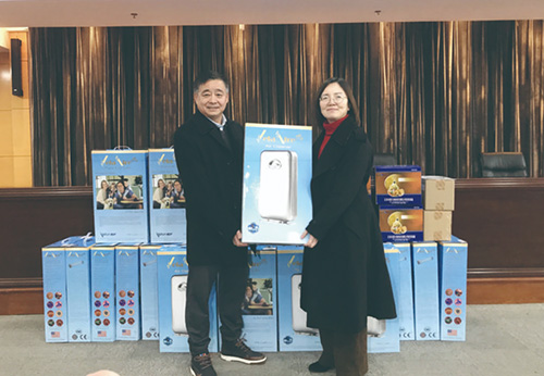 1月28日,安惠公司董事长陈惠带着20台安洁空气净化器等防护用品分赴南通开发区防控指挥部和南通大学附属医院。