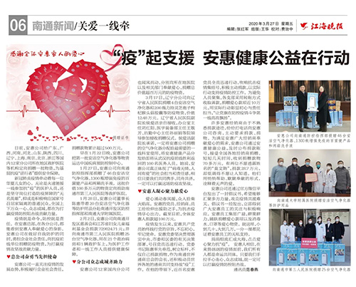 1月27日,安惠公司向南通防控指挥部捐赠了46台安洁空气净化器、1300瓶增强免疫的百菌健产品和两箱洗手液。这批价值100多万元的物资定向捐助南通市第三人民医院等救护医院。