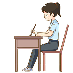 坐着时,我们经常会下意识地把头向前伸,这样是错误的。我们应该让颈椎回到中正位,手臂自然垂于桌面。