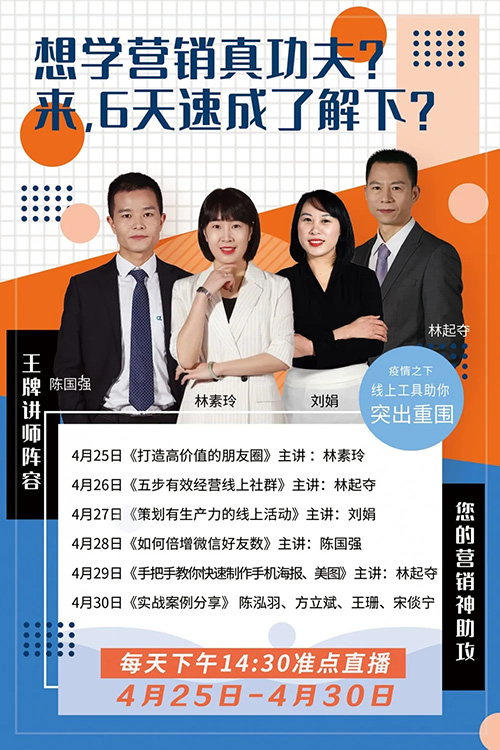 四位安发金牌讲师、市场一线的新生代营销达人,无私分享市场实战案例,千锤百炼的营销经验,搭配“四大天王”讲师的精品干货课程,让你少走弯路,在疫情中逆流而上,成为朋友圈里人人信赖的专家,让观众为你而来。
